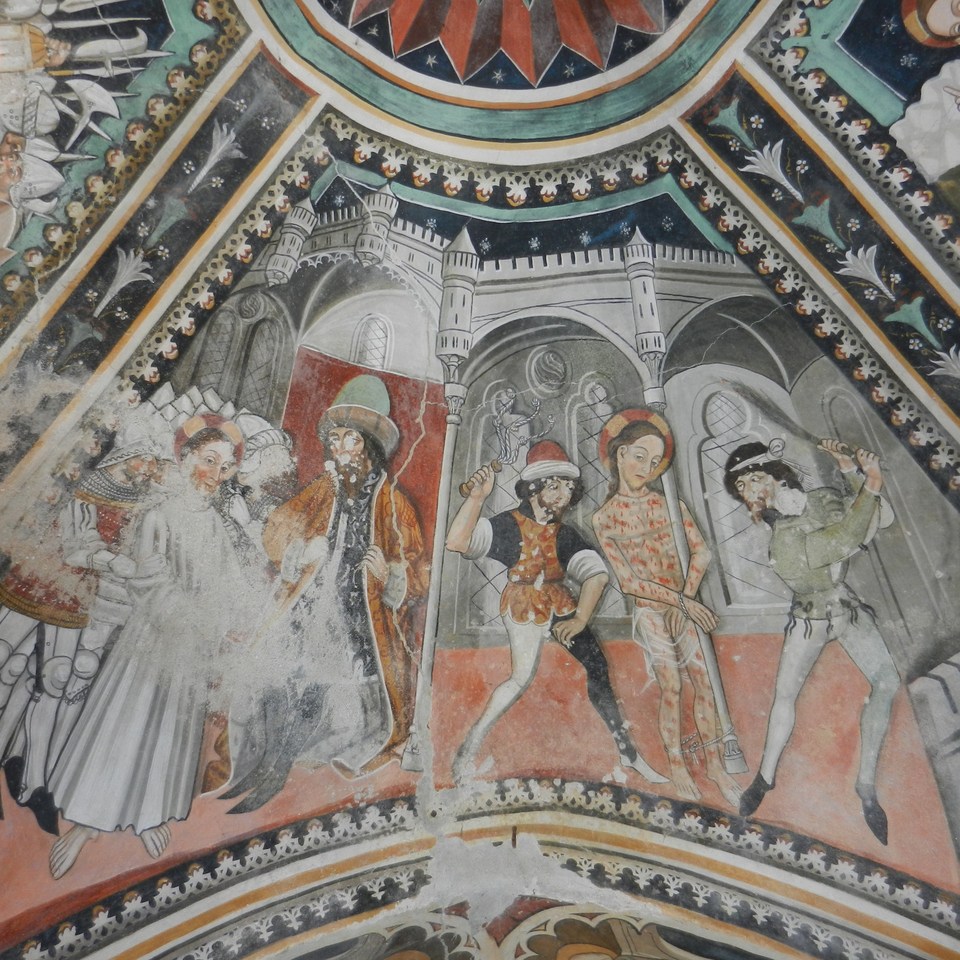 Il soffitto è diviso in quattro unghie: sopra l’altare sta Cristo Pantocratore nella mandorla; a destra il bacio di Giuda a Cristo; sull’ingresso Cristo da Pilato e la flagellazione alla colonna; a sinistra la Risurrezione e la discesa agli inferi.