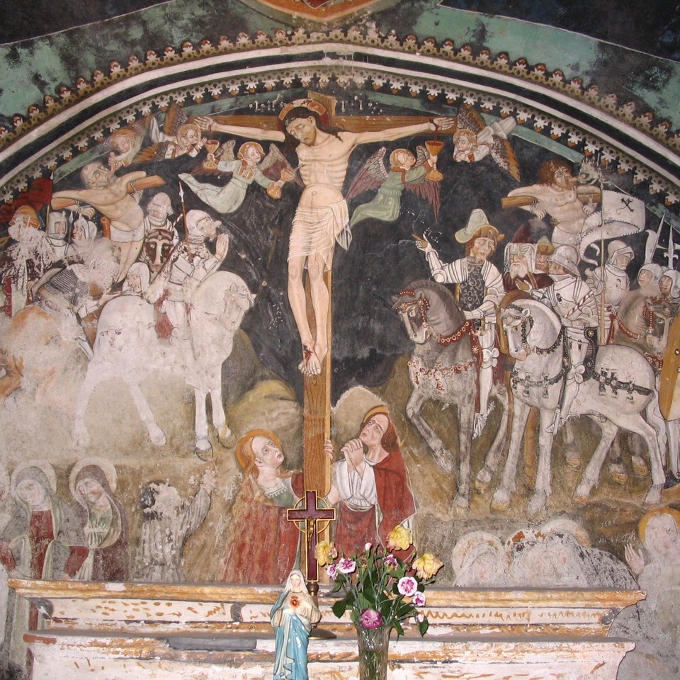 Sulla parete dietro l’altare una affollata Crocifissione dove ai piedi della croce troviamo la Maddalena inginocchiata, San Giovanni in piedi, Maria sorretta da donne dolenti, più indietro, cavalieri e soldati. Un angelo accoglie l’anima del buon ladrone mentre un diavolo quella del cattivo ladrone; altri angeli raccolgono nei calici il sangue di Cristo che zampilla dal costato e dalle mani.