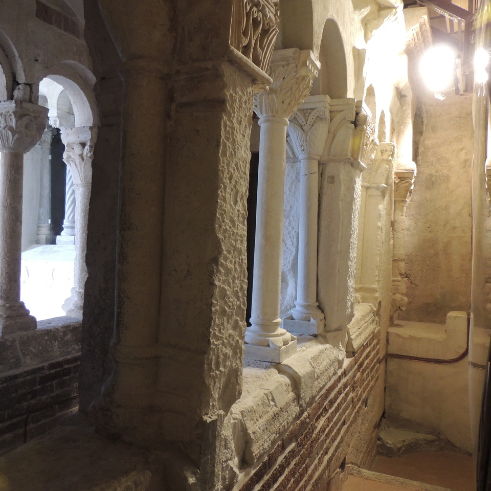 Il "Percorso archeologico dei sottotetti" ha inizio dalla scala ottocentesca che li raggiunge partendo dal deambulatorio. Durante la salita si ammira la struttura muraria dell’abside medievale in cui spiccano le aperture della monofora del lato sud e l’accesso alla loggia absidale esterna. Raggiunto l’accesso ai sottotetti una passerella metallica si snoda tra una campata e l’altra sospesa sull’estradosso delle volte. Di volta in volta, emergono dapprima il coronamento ad archetti pensili della navata centrale e poi, le strutture antiche della navata minore intervallate dal transetto con la bifora. Dove il percorso sembrerà concludersi, il visitatore potrà immergersi nelle membra dell’architettura medievale per raggiungere gli elementi decorativi più nascosti e ritrovarsi, dopo una discesa verticale nello spessore di muro, nei matronei dell’atrio per poi scendere nell’atrio.