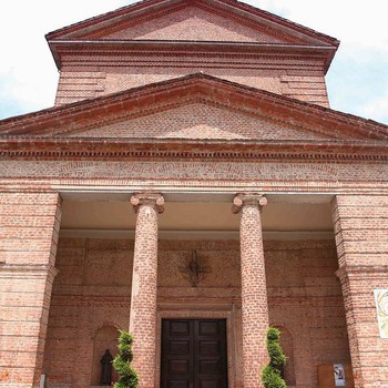 La chiesa fu costruita dal 1640. L’attuale facciata, dipinta a strisce bianche e nere, con un rosone centrale e bifore in cemento, risale al 1935.
