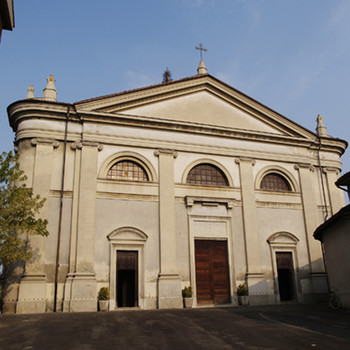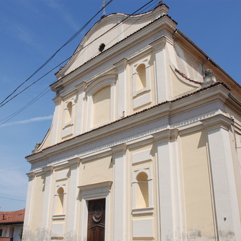 La chiesa risale al XIII secolo ed è caratterizzata dalla robusta e quadrata torre campanaria. Nella vicina canonica sono conservate una Madonna col Bambino e angeli musicanti e la Santa Apollonia, tavole di Gandolfino da Roreto, maestro del Rinascimento piemontese e la tela seicentesca di S. Ambrogio, del Moncalvo. Restaurata e riaperta nel 2007, il presbiterio conserva ancora la balaustra con il cancello. Pianta ad aula unica a croce latina con cappelle laterali